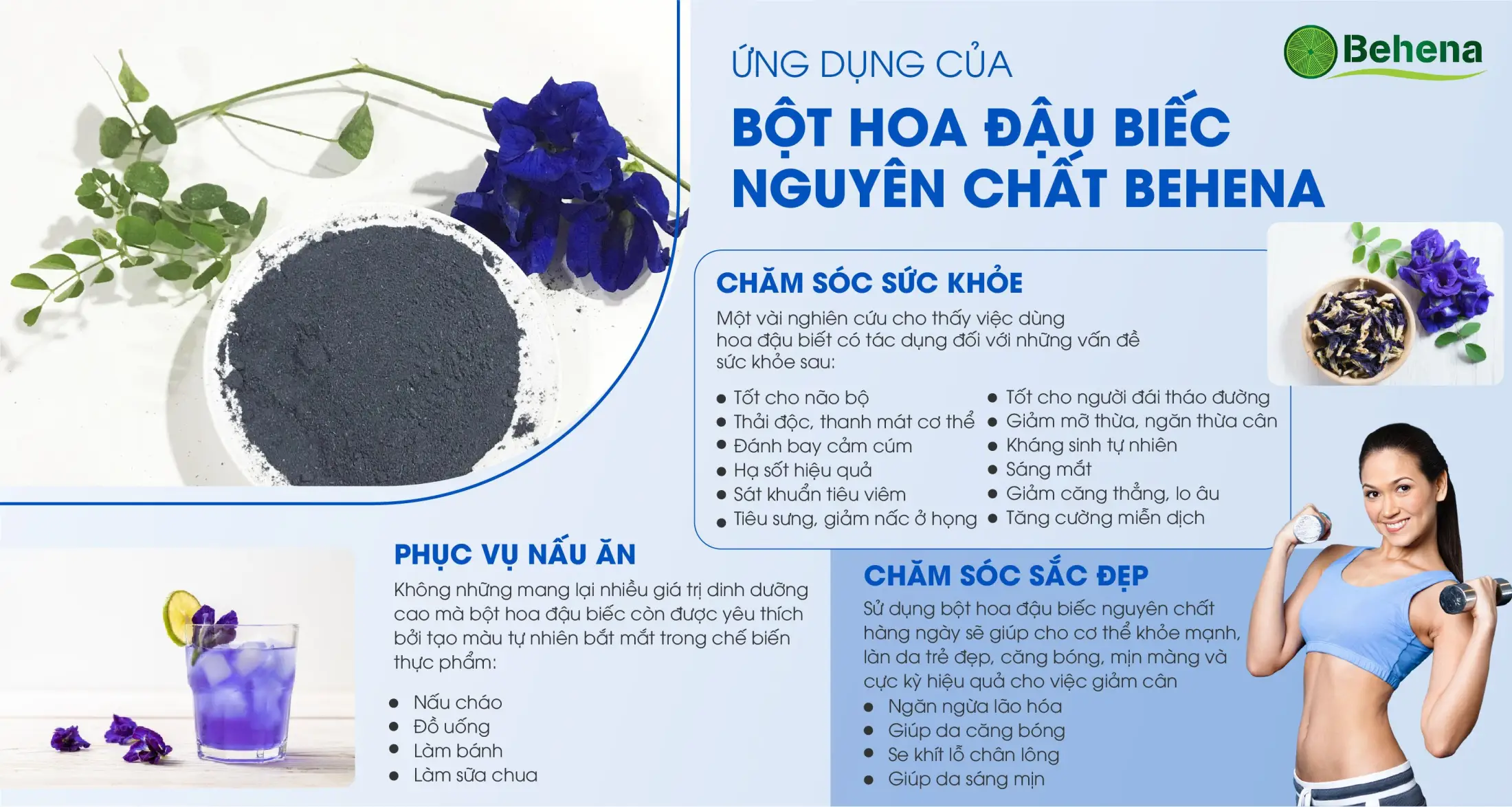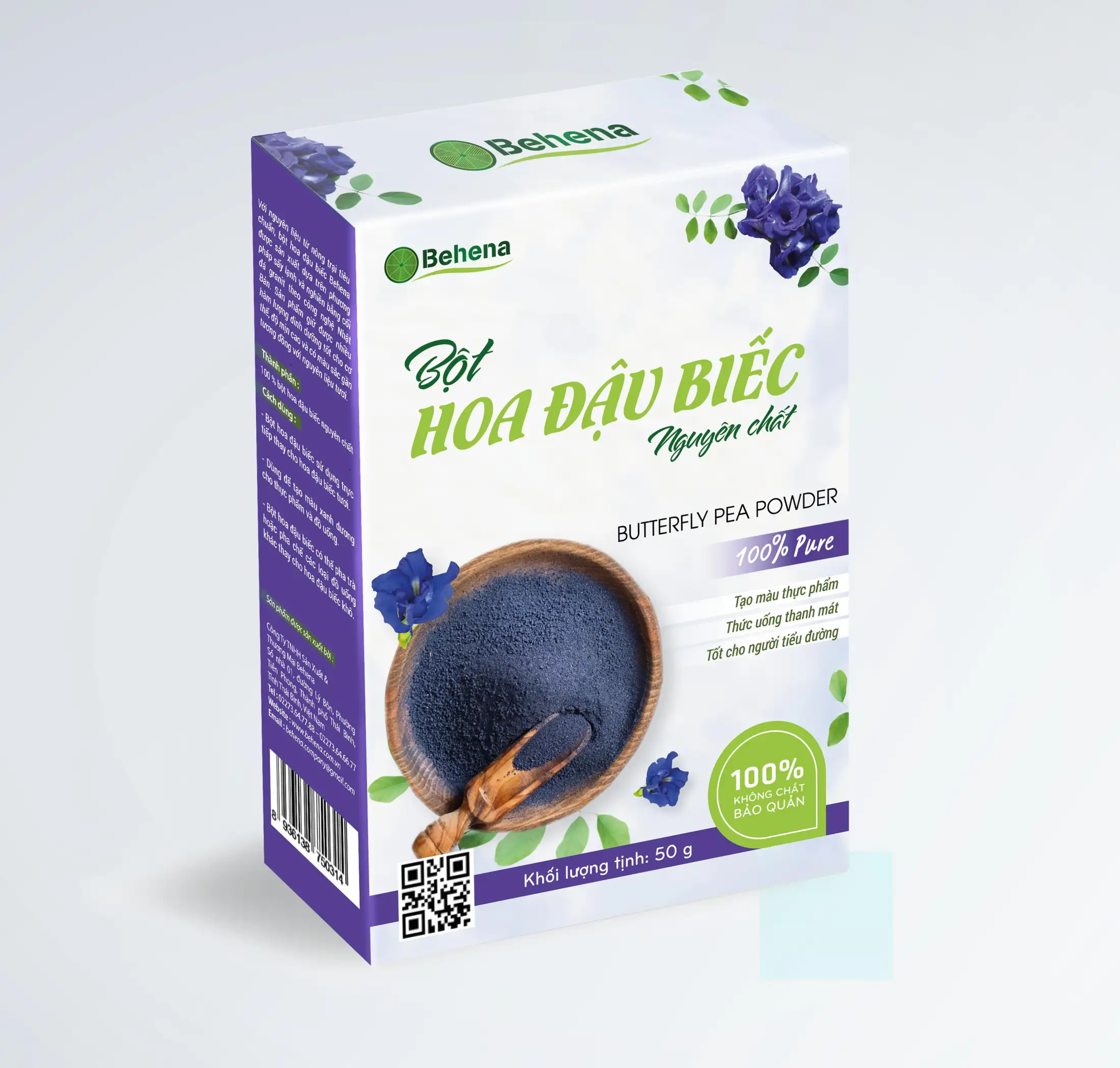 Với nguyên liệu từ nông trại tiêu chuẩn, bột hoa đậu biếc Behena được sản xuất dựa trên phương pháp sấy lạnh và nghiền bằng cối đá granit theo công nghệ Nhật Bản. Sản phẩm giữ được nhiều hàm lượng dinh dưỡng tốt cho cơ thể, độ mịn cao và có màu sắc gần tương đồng với nguyên liệu