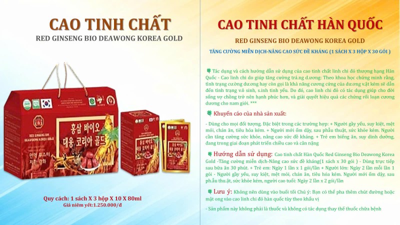 🍀Hướng dẫn sử dụng: Cao tinh chất Hàn Quốc Red Ginseng Bio Deawong Korea Gold -Tăng cường miễn dịch-Nâng cao sức đề kháng(1 sách x 30 gói ) - Dùng trực tiếp sau bữa ăn 30 phút. + Trẻ em: Ngày 1 lần x 1 gói/lần + Người lớn: Ngày 2 lần mỗi lần 1 gói - Người gầy yếu, suy kiệt, mệt mỏi, chán ăn, tiêu hóa kém. Người mới ốm dậy, sau ph.ẫu thu.ật, sức khỏe kém, người cao tuổi: Ngày 2 lần x 2 gói/lần